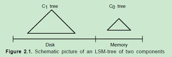 LSM-tree 的主要思想是划分不同等级的树。以两级树为例,可以想象一份索引数据由两个树组成,一棵树存在于内存,一棵树存在于磁盘。内存中的树可以可以是 AVL Tree 等结构;因为数据大小是不同的,没必要牺牲 CPU 来达到最小的树高度。而存在于磁盘的树是一棵 B-Tree。