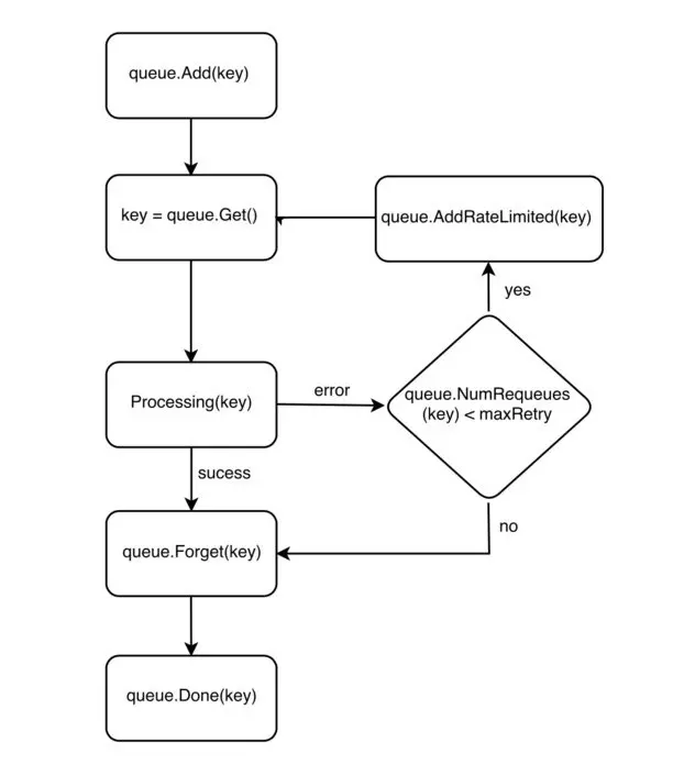 如果处理事件失败,控制器就会调用 AddRateLimited() 函数将事件的 key 放回 Workqueue 以供后续重试(如果重试次数没有达到上限)。如果处理成功,控制器就会调用 Forget() 函数将事件的 key 从 Workqueue 中移除。注意:该函数仅仅只是让 Workqueue 停止跟踪事件历史,如果想从 Workqueue 中完全移除事件,需要调用 Done() 函数。