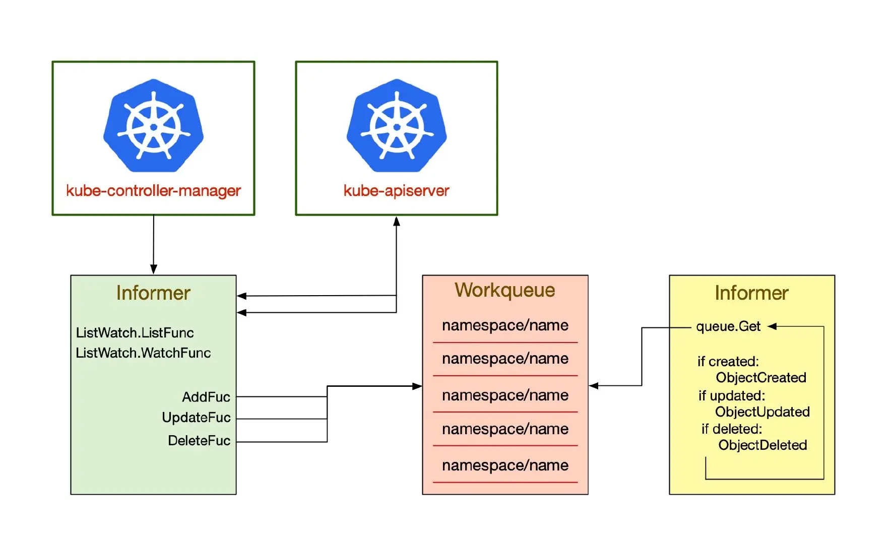每个控制器内部都有两个核心组件:Informer/SharedInformer 和 Workqueue。其中 Informer/SharedInformer 负责 watch Kubernetes 资源对象的状态变化,然后将相关事件(evenets)发送到 Workqueue 中,最后再由控制器的 worker 从 Workqueue 中取出事件交给控制器处理程序进行处理。