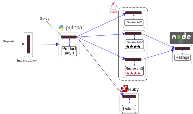 Bookinfo 是一个异构应用,几个微服务是由不同的语言编写的。这些服务对 Istio 并无依赖,但是构成了一个有代表性的服务网格的例子:它由多个服务、多个语言构成,并且 reviews 服务具有多个版本。