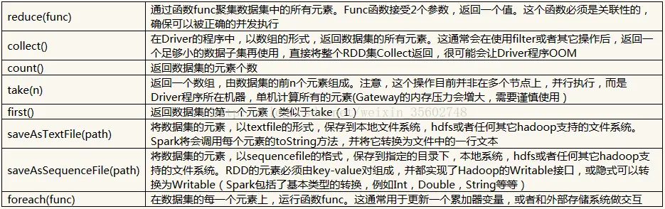 Action操作会对 RDD 计算出一个结果,并把结果返回到驱动器程序中,或把结果存储到外部存储系统(如 HDFS)中。