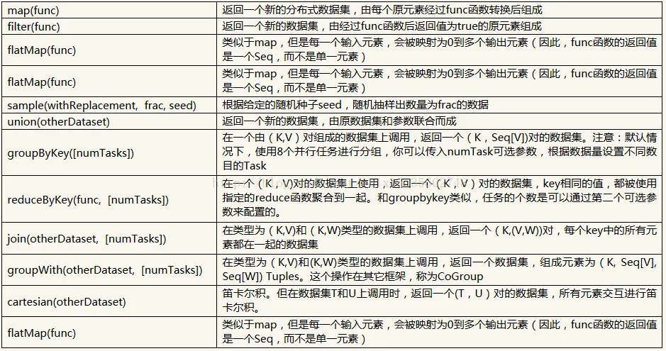 Transformation操作会由一个RDD生成一个新的 RDD。Transformation操作是延迟计算的,也就是说从一个RDD转换生成另一个RDD的转换操作不是马上执行,需要等到Actions操作时,才真正开始运算。