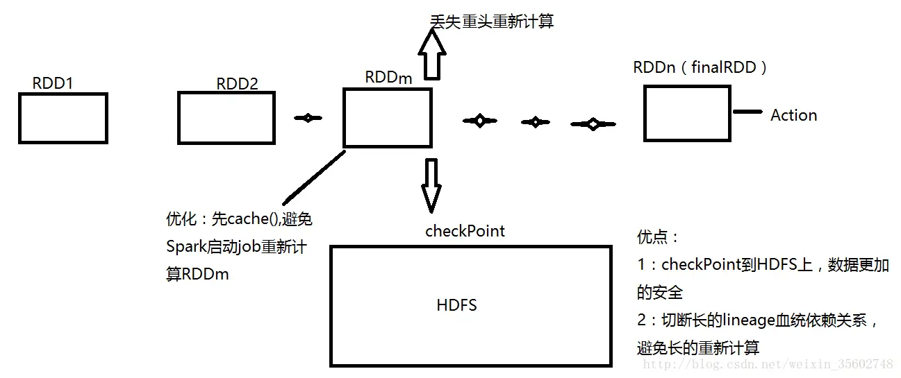 - Spark会自动的启动一个job来重新计算标记了的RDD,并将计算的结果存入HDFS,然后切断RDD的依赖关系