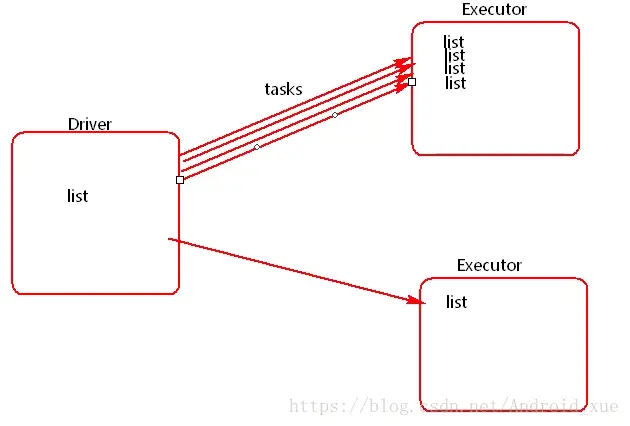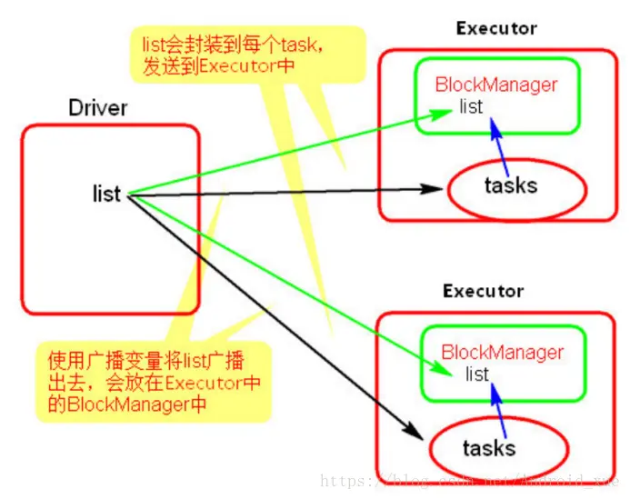 有时会变量是在driver端创建的,但是因为需要在excutor端使用,所以driver会把变量以task的形式发送到excutor端,如果有很多个task,就会有很多给excutor端携带很多个变量,如果这个变量非常大的时候,就可能会造成内存溢出(如下图所示)。这个时候就引出了广播变量。