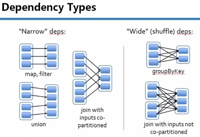 指子RDD的分区依赖于父RDD的所有分区,这是因为shuffle类操作,如图中的groupByKey和未经协同划分的join。