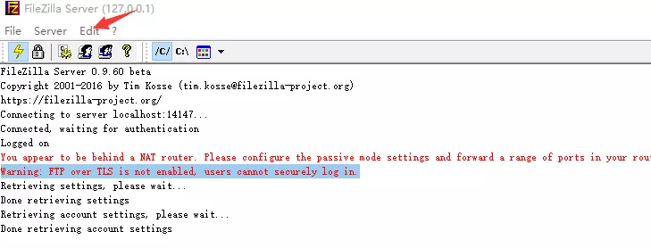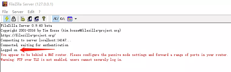 连接成功后(Logged on),日志面板会出现问题跟警告两行红字,这里的问题跟警告并不会对FTP服务器搭建以及连接FTP服务器有影响,因此不对其处理