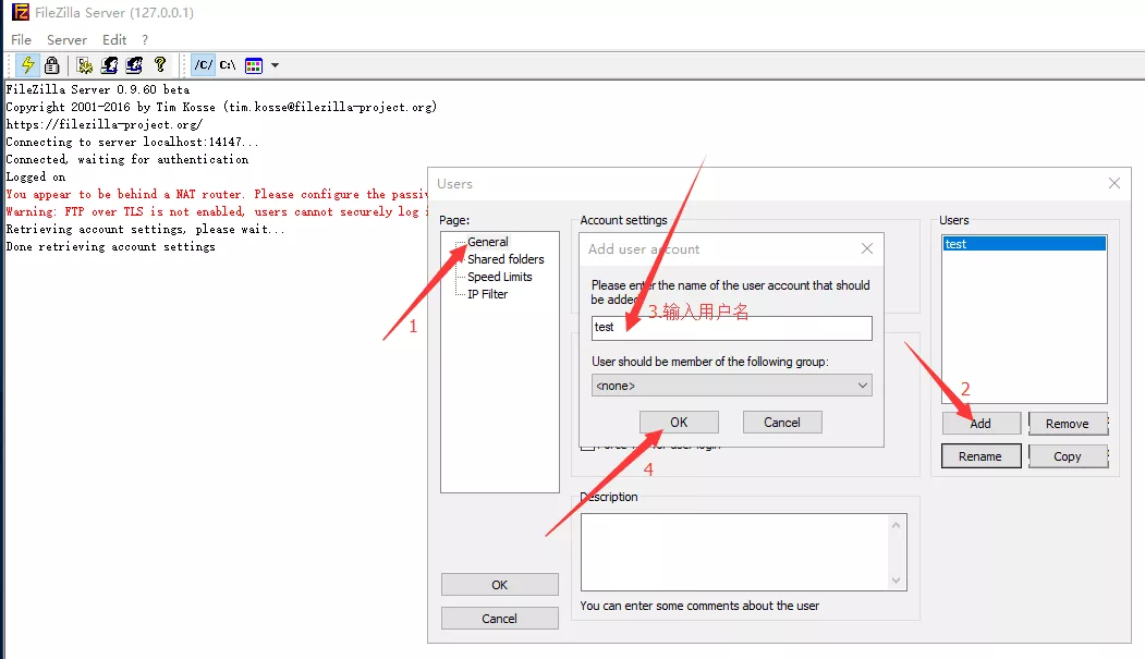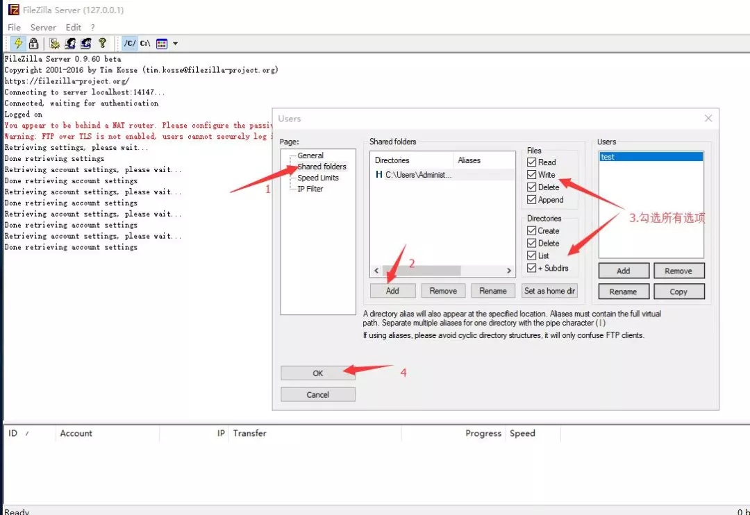 到这里,使用FileZilla Server搭建FTP服务器就完成了