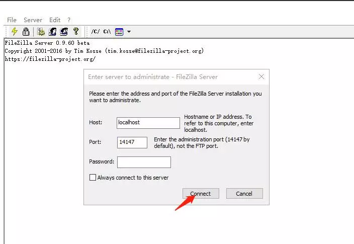 Host默认为localhost(或 127.0.0.1),即默认将本机作为FTP服务器。点击Connect连接