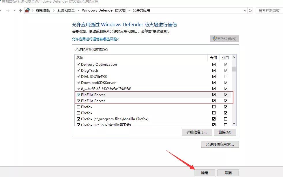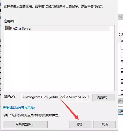 四、将FileZilla Server添加为防火墙允许的应用