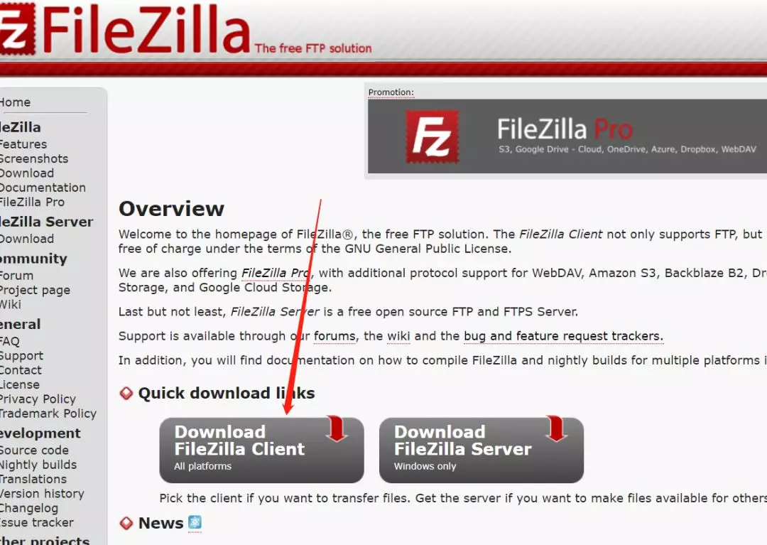 注意:此时下载的是红色箭头指向的FileZilla Client客户端