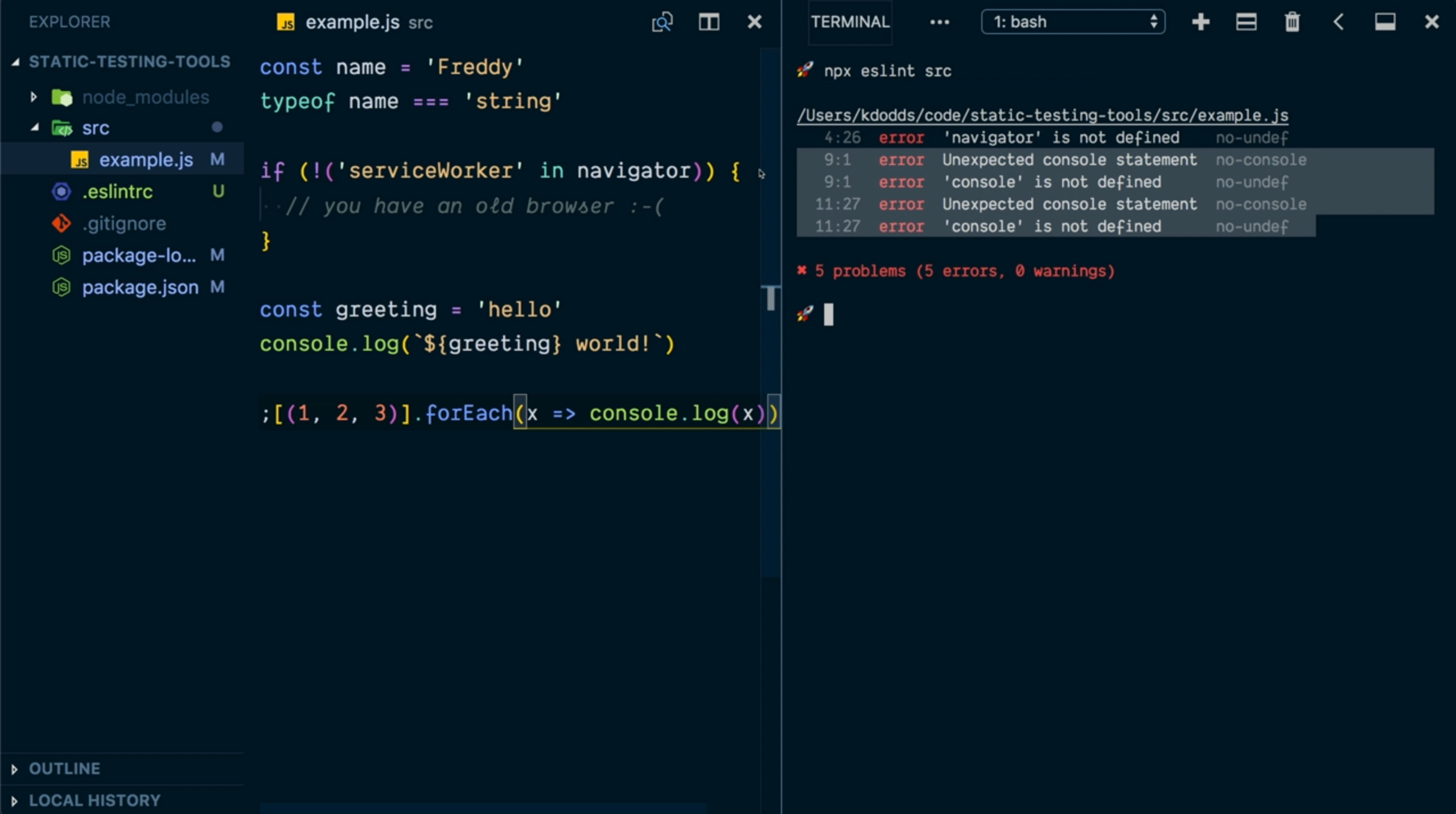Then I can go into my example.js. I can fix each one of these to avoid the problems these eslint rules were written for. To save us some time, I'm going to go ahead and just paste in the fixed code. With that code fixed, now I can run npx eslint src. I'm getting a couple other errors that I'm going to configure eslint to avoid.