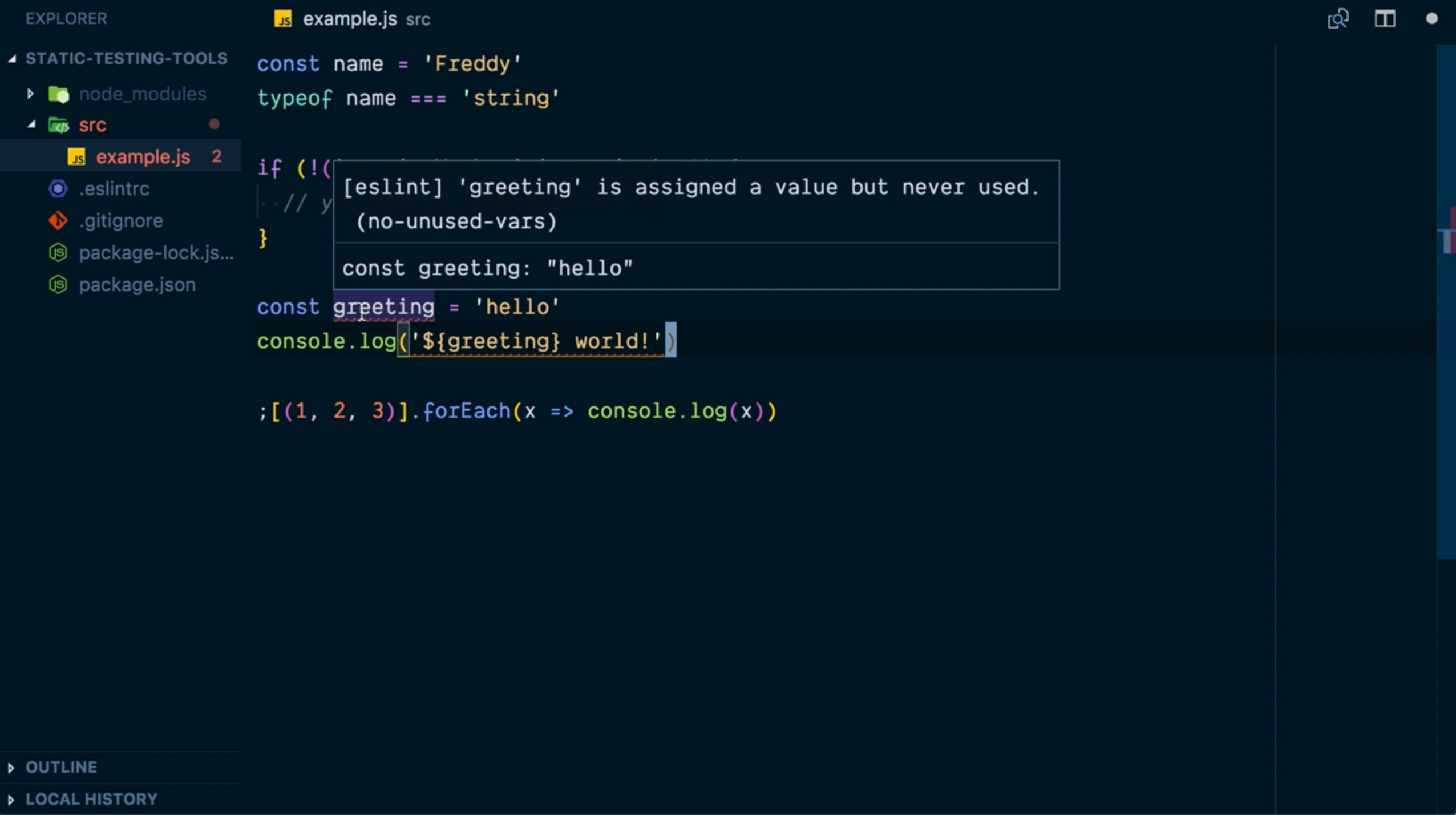 Then I'll reload my editor. Now if I go to thatexample.js file and I make some sort of error, like change this to a regular string, I'm going to see an error here without having to run the eslint script in the terminal. This helps me have a much faster feedback loop as I'm editing the code.