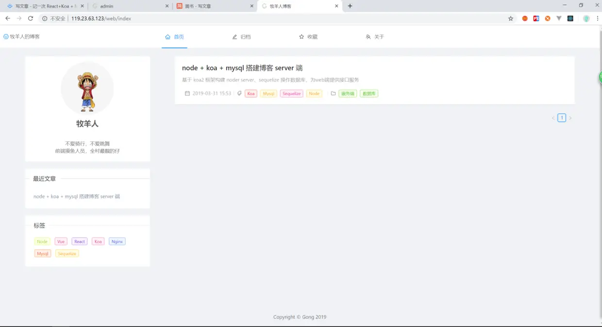 之前没有写过 node server 和 react,算是从零搭建该博客,踩了一些坑,也学到了很多东西,譬如react 开发模式、react-router、sequelize 操作mysql的crud、koa、nginx的配置等等。