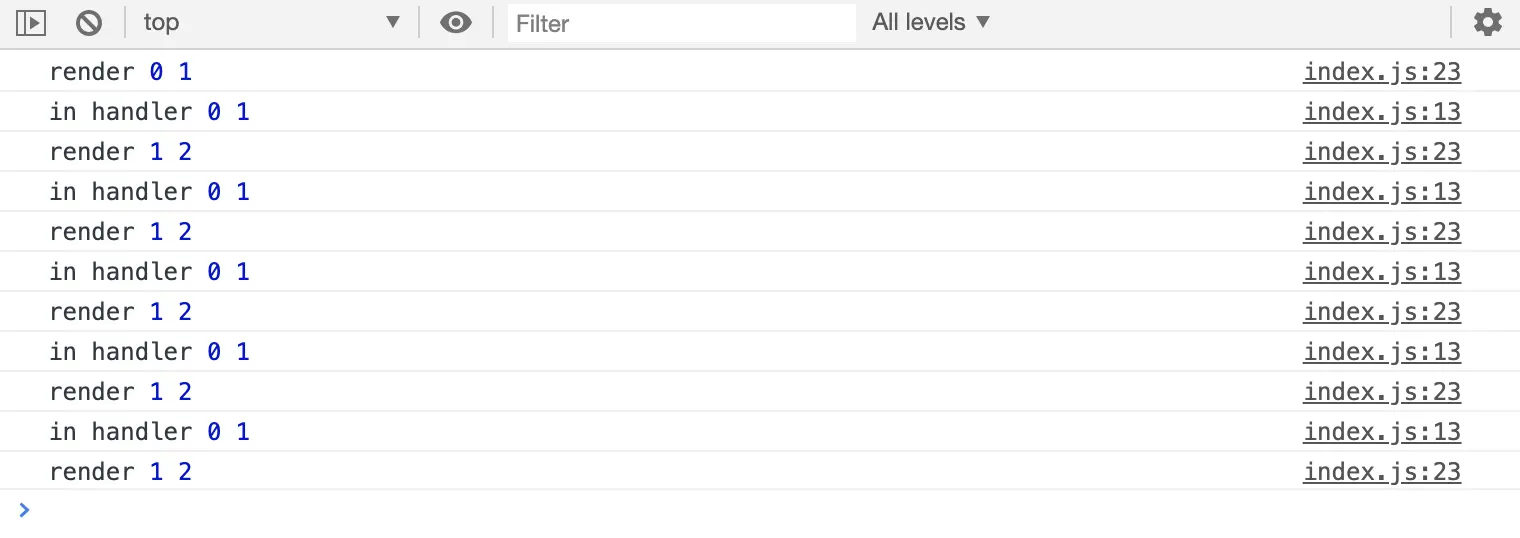 我们把上面说过的作用域概念引入就很好解释了,当第一次执行render的时候,render函数创建了一个作用域,这个作用域中count = value.count,也就是0,这时init为true,所以handler被定义,词法作用域被创建,它的上层作用域就是刚才执行render的创建的作用域。