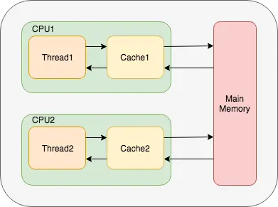 在多线程应用中,对于没有volatile修饰的变量,每个线程在执行过程中都会从主存中拷贝一份变量的副本到cpu缓存中.假设计算机中拥有多个cpu,每个线程可能在不同的cpu上执行,即每个线程很可能将变量加载到不同的cpu缓存中.如图所示: