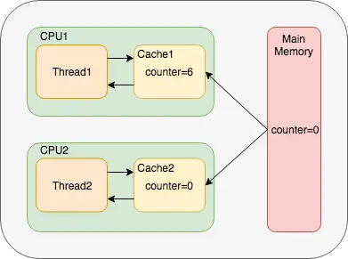 如果没有将变量counter修饰为volatile将不能保证对变量counter的修改会在何时写回主存.这意味着不同cpu缓存中counter变量的值可能与主存中不一样.如图所示: