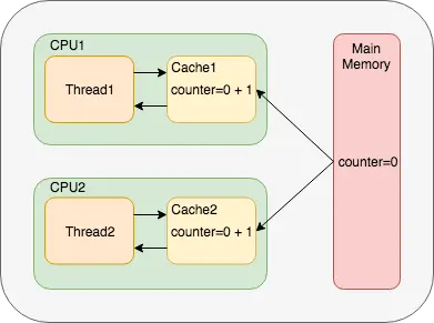 当线程1从主存加载counter到cpu缓存中,此时counter为0,对counter进行累加之后counter变为1,此时线程1还没有将counter写回主存,线程2同样将主存中counter加载到cpu缓存中进行累加操作.此时线程2也还没有将counter写回主存.