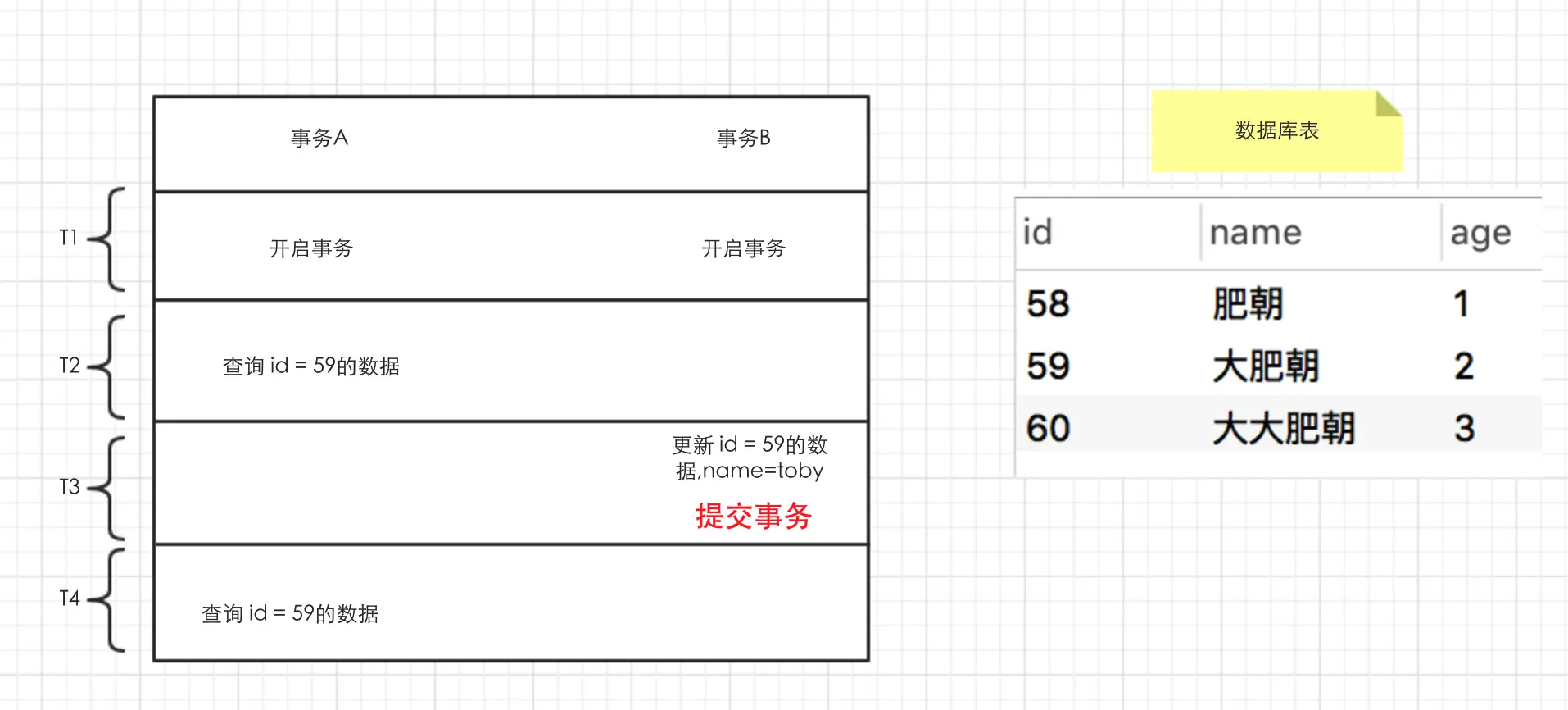 比如我问,当t4时,查询出来的数据,name是大肥朝还是toby.其实你内心就不是很确定了,但是我如果把提交事务这几个字加粗标红,然后引诱一下,绝大多数同学根本把持不住!!!
