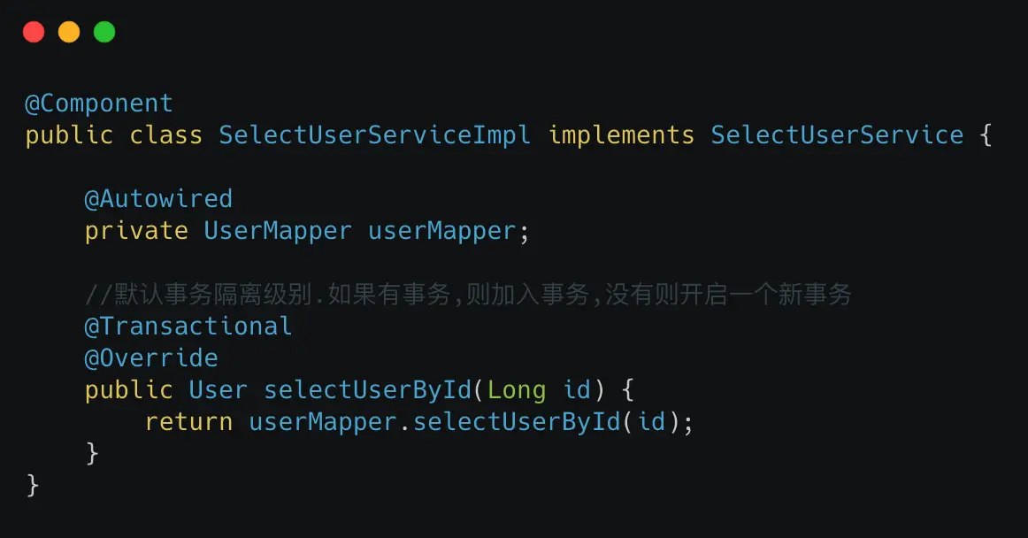 REQUIRED : 用得最多(估计高达90%),也是默认的模式.若当前没有事务,则新建事务,若当前已存在一个事务, 则加入到该事务中