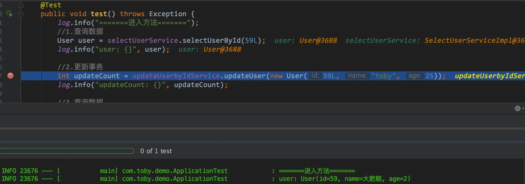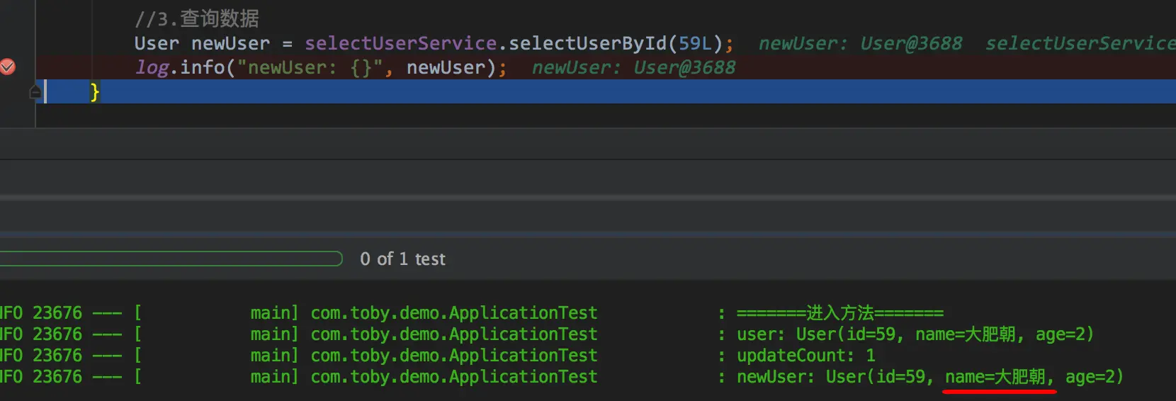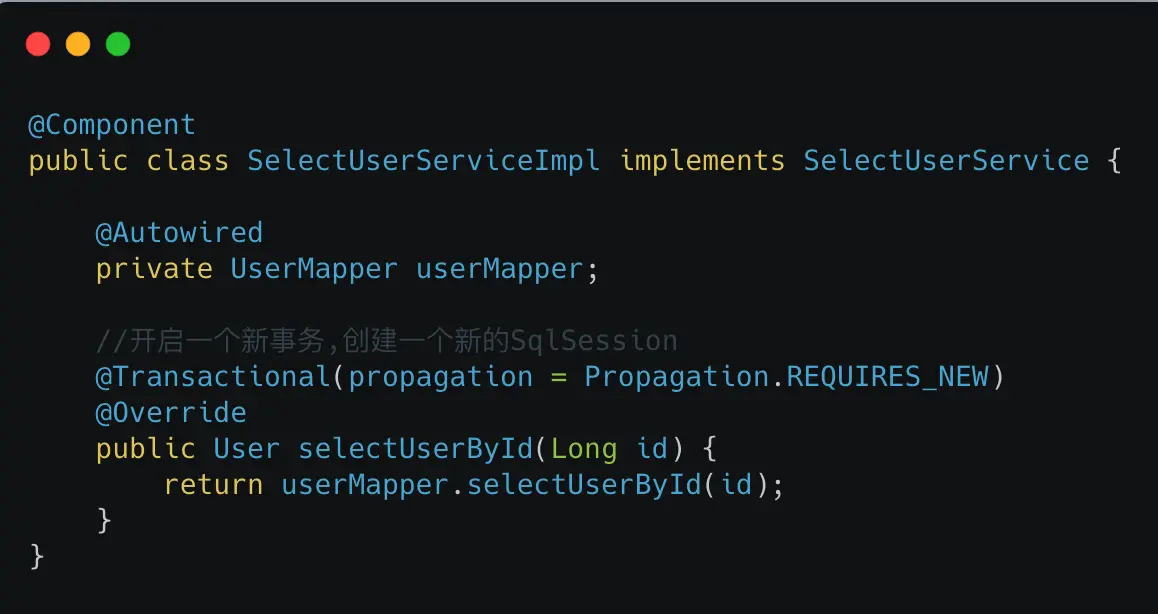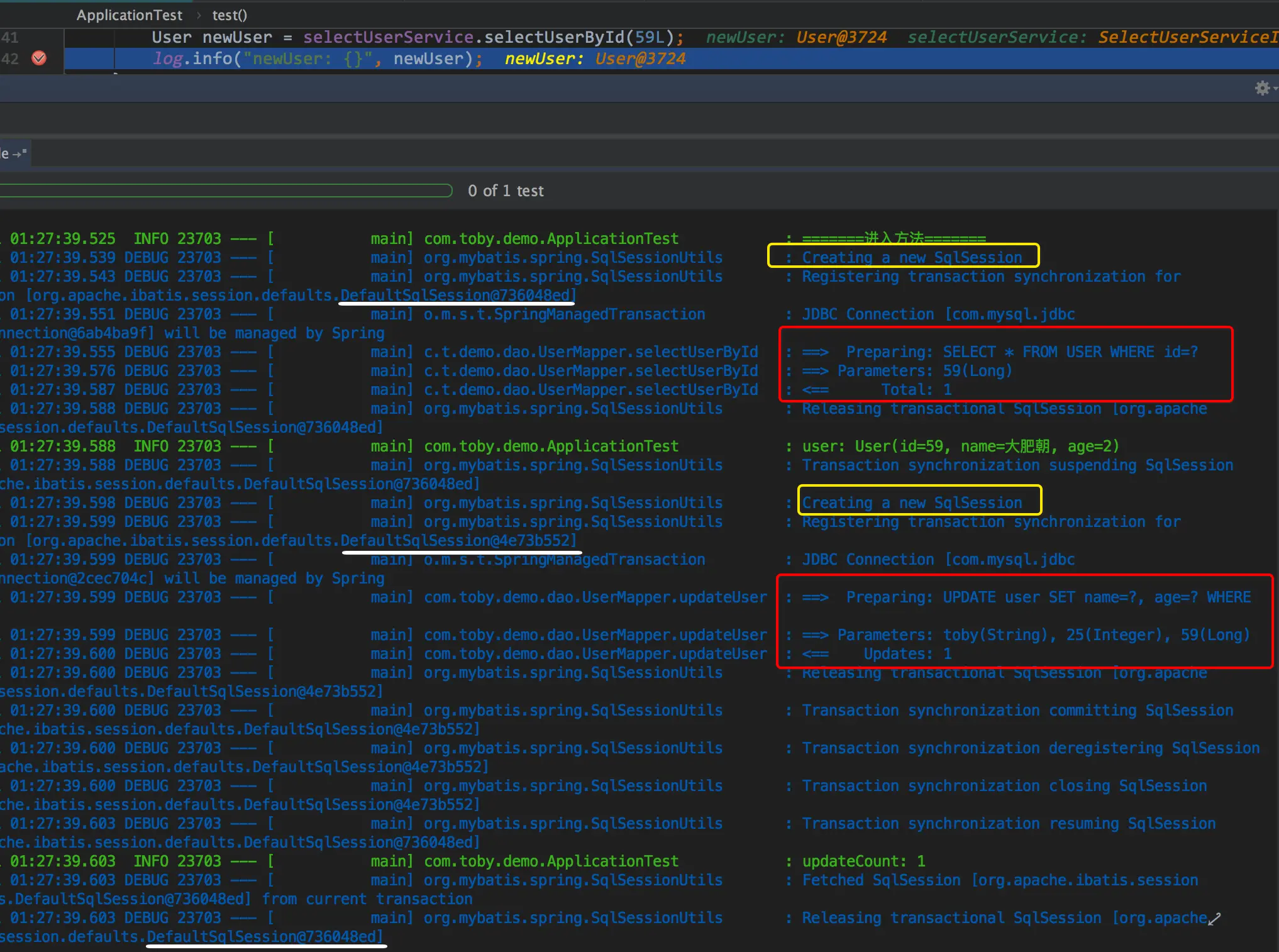 解决办法有很多,我们知道Mybatis一级缓存的作用域是SqlSession,那么只要两次查询是不同的SqlSession那自然这个一级缓存就失效了.一级缓存失效了.就会查询两次,输出两次sql.这个时候是toby还是大肥朝就真的取决于我前面说的隔离级别了.比如一个简单的改法是