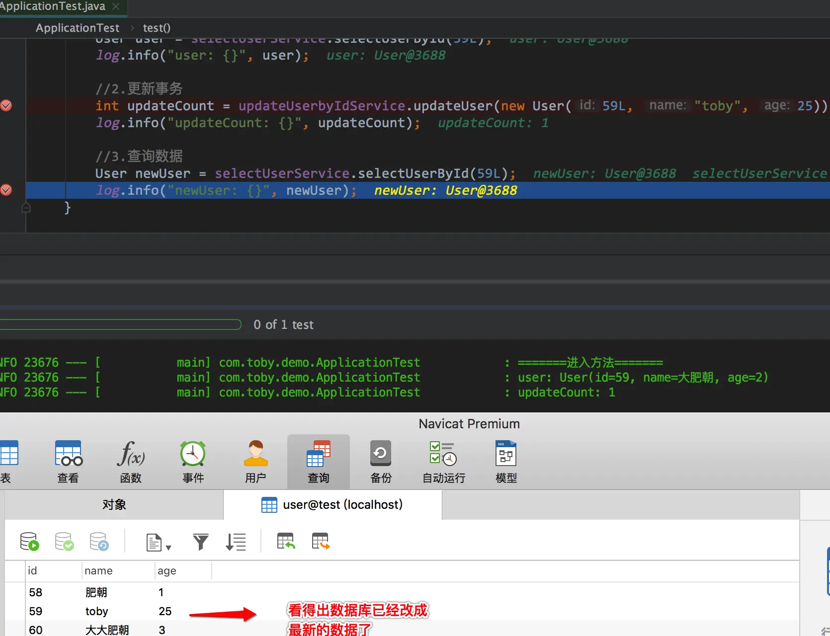 2.更新完成提交了事务,我们看得出此时数据库已经改成了toby