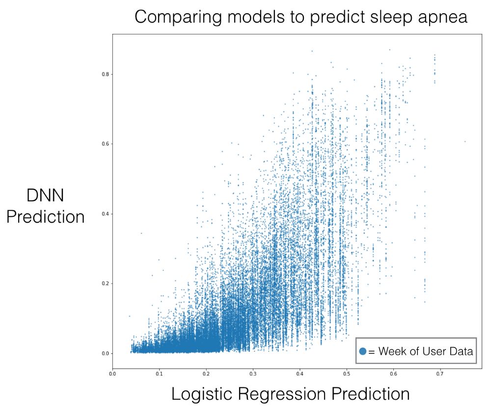 例如,我们好奇 DNN 是否真的用心率输入来生成预测,或者说它的学习是不是严重依赖于所提供的元数据——我们用性别、年龄这样的用户元数据来初始化 LSTM 的状态。为了理解这个,我们将模型与在元数据上训练的 logistic 回归模型做了对比。