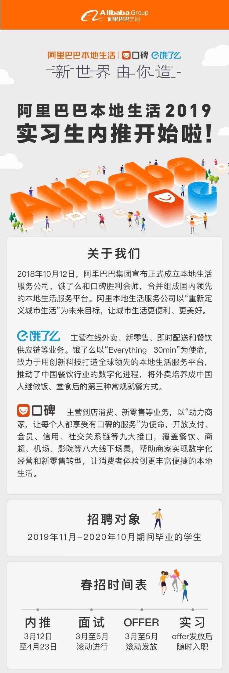 今天来发一个招聘贴,3月12号阿里2019年校招正式开始,有兴趣的同学可以找我来内推,阿里巴巴集团和我所在的阿里巴巴本地生活服务公司各种岗位都缺!