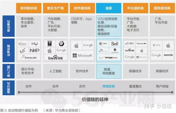 在车联时代,全面的无线连接可以将诸如导航系统等附加服务集成到车辆中,以支持车辆控制系统与云端系统之间频繁的信息交换,减少人为干预。以自动驾驶为例,端到端价值链如上图所示。