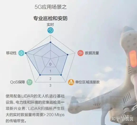 使用配备LiDAR的无人机进行基础设施、电力线和环境的密集巡检是一项新兴业务,LiDAR扫描所产生巨大的实时数据量将需要> 200 Mbps的传输带宽。