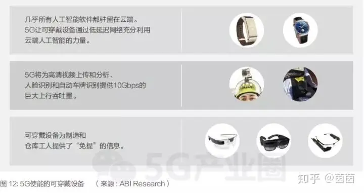 5G将同时为消费者领域和企业业务领域的可穿戴和智能辅助设备提供机会。可穿戴设备将为制造和仓库工作人员提供“免提”式信息服务。云端AI使可穿戴设备具有AI能力,如搜索特定物体或人员。