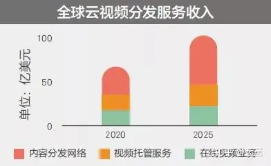 - 云视频服务的货币化正在加速,内容分发网络、视频托管服务和在线视频服务的市场空间将从2020年的60亿美元增加到2025年的100亿美元。