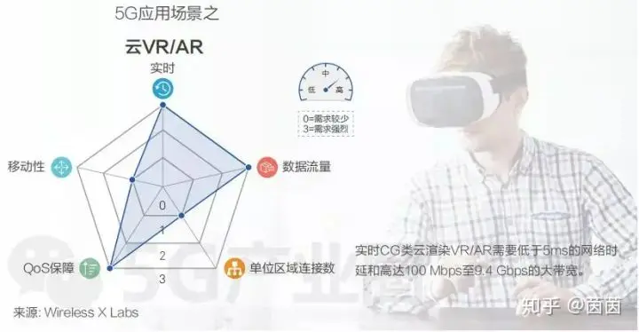 VR/AR业务对带宽的需求是巨大的。高质量VR/AR内容处理走向云端,满足用户日益增长的体验要求的同时降低了设备价格,VR/AR将成为移动网络最有潜力的大流量业务。虽然现有4G网络平均吞吐量可以达到100Mbps,但一些高阶VR/AR应用需要更高的速度和更低的延迟。