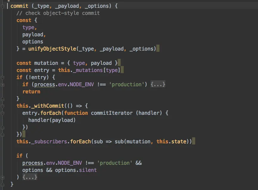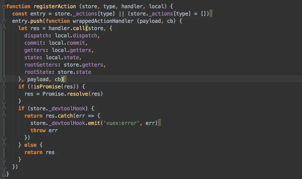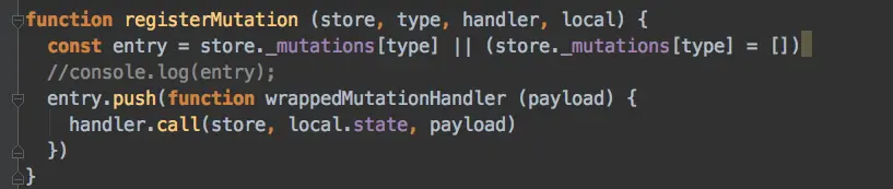 我们发现,entry是被一个函数包裹起来,然后将local.store和payload绑定到这个handle的参数上,然后把handle的this指向锁定到了Store实例上,所以mutation在被commit调用的时候只传入了一个参数payload, 但是mutation函数执行的时候就有了两个参数。