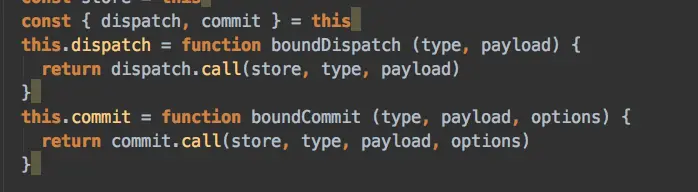 - dispatch和commit中都使用了this(指向Store实例),为了防止this的指向改变从而出现问题,就把原型上的dispatch与commit在constructor中处理到了实例本身,这个过程做了this指向的绑定(call)。