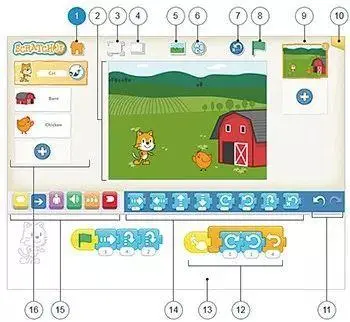 Scratch主要面向8~16岁儿童,而ScratchJr则主要针对5~7岁低龄儿童。相比Scratch,ScratchJr以平板电脑为载体,编程模块的体积更大、素材库中的图片更多、拼插方式也更直接。ScratchJr的界面示意图如下。