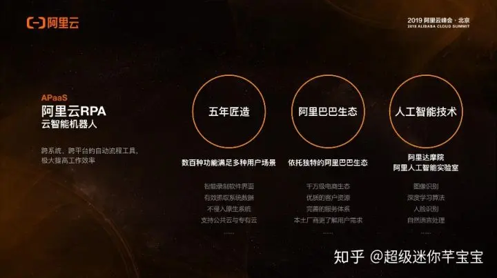 与其具备类似效果的还有阿里云RPA(又名机器人流程自动化),此产品能代替人做电脑端重复性高、劳力密集且低效率的工作,解决企业因此类工作人均产值低、运维成本高等痛点。尤其在银行、保险、电商、政务等领域,无论是财务对账还是运营类活动,里面涉及到大量的工作都是要重复操作的,浪费了人力做价值低的事情。