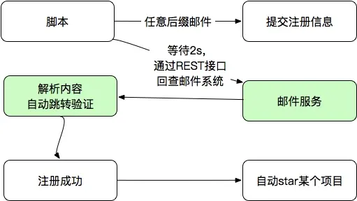 垃圾邮件,很多人都深受其害,但我们今天并不是要搞它。以相反的方式进行思考,我们并不讨厌它,而且欢迎它的到来。比如,我要批量注册一万个github账号。github通过邮箱验证就算注册成功了,这个时候,我们需要一个邮件服务器,具体流程如下: