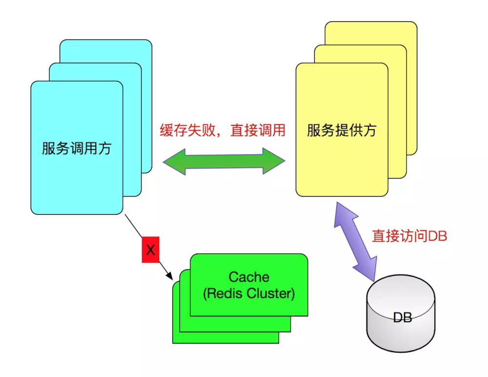 或许部分同学会问,缓存如果挂了,把缓存重启或者启动起来不就可以了吗?没错,缓存挂了,确实需要尽快将缓存恢复回来,但是如果认为缓存挂了,就直接重启缓存就完事了,那就将问题看得过于简单化了。对于一个大型互联网系统而言,这时服务调用方是无法对缓存进行存取操作,只能将流量完全打到服务方系统,服务方系统面对服务过载在劫难逃。接下来就不是缓存宕机那么简单了,而是系统不可用,乃至对外服务彻底瘫痪掉。反过来说,缓存启动后,缓存里的数据已经还在初始化中,缓存查询还是无法进行,所有的流量还是会继续打到服务方系统上。