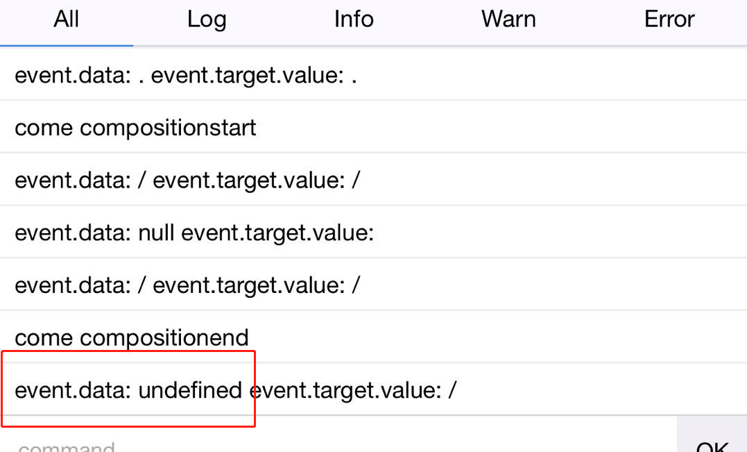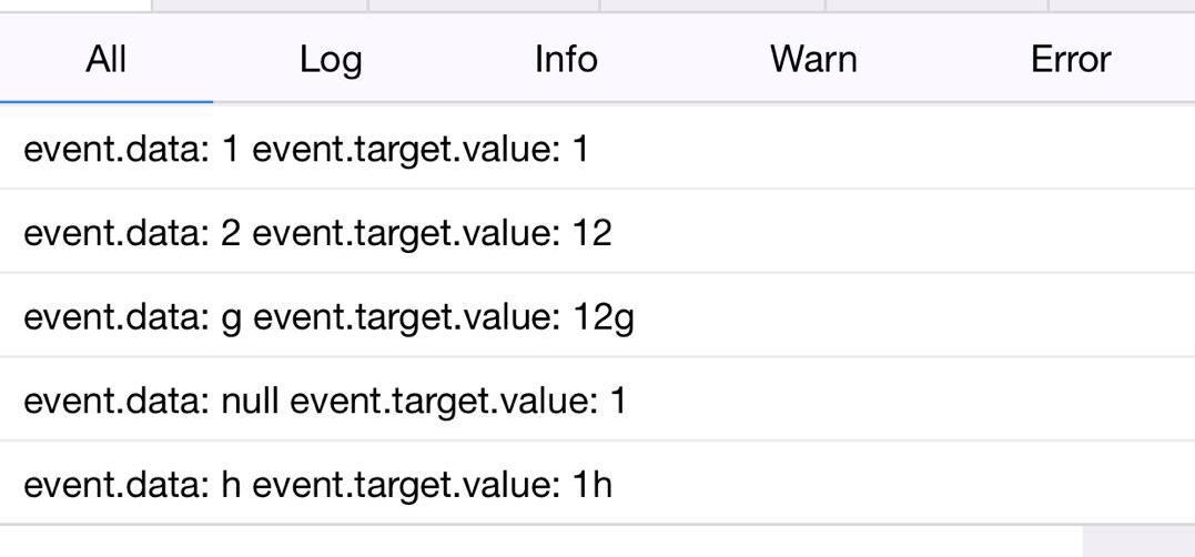 我们先输入的12 如我们连续的在9宫格ghi键上连续点两次,ios最终正常显示是会显示h 中间触发的事件变化是(会触发三次input事件) event.data第一次是g,第二次是null,第三次的h