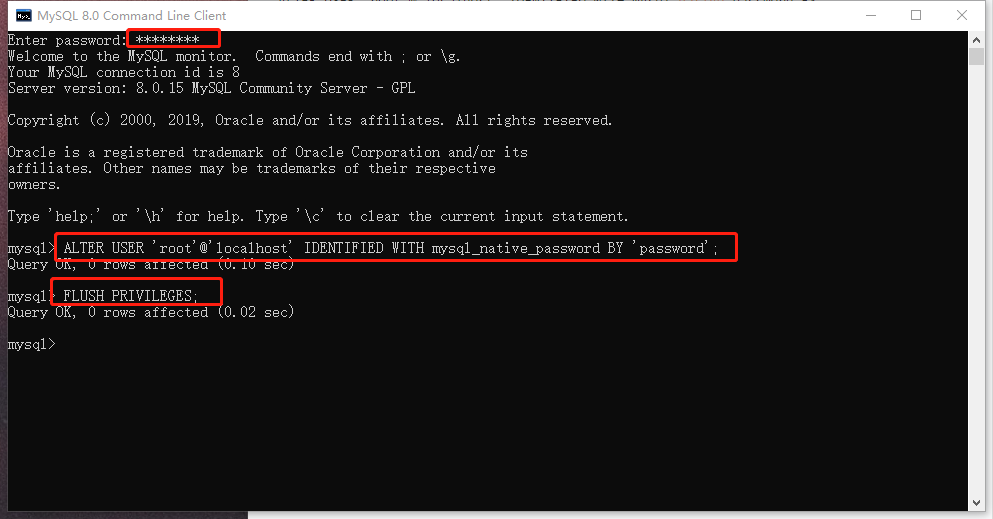 - 输入ALTER USER 'root'@'localhost' IDENTIFIED WITH mysql_native_password BY 'mysql的密码';