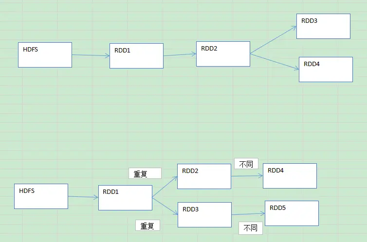 另外一种情况,在上图第二条DAG中国,从一个RDD到几个不同的RDD,算子和计算逻辑其实是完全一样的,结果因为人为的疏忽,计算了多次,获取到了多个RDD。这个也是尽量要避免的。
