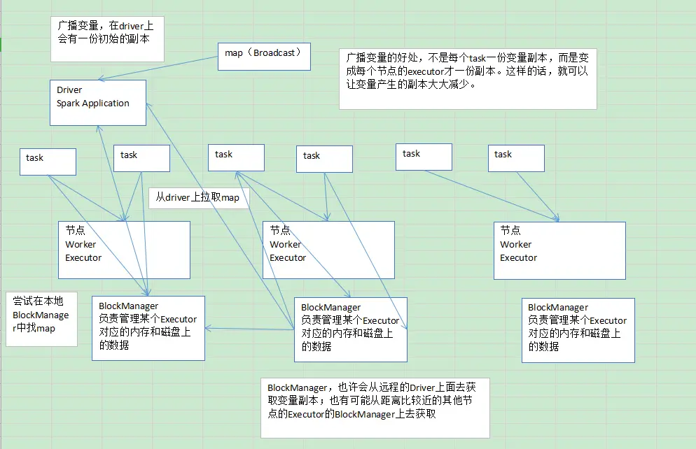 - task在运行的时候,想要使用广播变量中的数据,此时首先会在自己本地的Executor对应的BlockManager中,尝试获取变量副本;如果本地没有,那么就从Driver远程拉取变量副本,并保存在本地的BlockManager中;此后这个executor上的task,都会直接使用本地的BlockManager中的副本。
