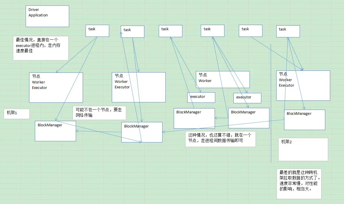 对于我们来说,当然不希望是类似于第二种情况的了。最好的,当然是task和数据在一个节点上,直接从本地executor的BlockManager中获取数据,纯内存,或者带一点磁盘IO;如果要通过网络传输数据的话,那么实在是,性能肯定会下降的,大量网络传输,以及磁盘IO,都是性能的杀手。