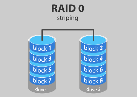 RAID 0可跨任意数量(至少2个)的磁盘分割数据,从而实现更高的数据吞吐量。从多个磁盘读取单个文件,使其可以访问所有磁盘的速度和容量。此RAID级别通常称为条带化,具有提高性能的优势。但是,它不会促进任何类型的冗余和容错,因为它不会复制数据或存储任何校验信息。两个磁盘都显示为单个分区,因此当其中一个磁盘发生故障时,它会破坏阵列并导致数据丢失