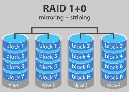 RAID 10将RAID 1的镜像与RAID 0的条带化相结合。或者换句话说,它将RAID 1的冗余与RAID 0的性能提升相结合。它最适合需要高性能和安全性的环境。