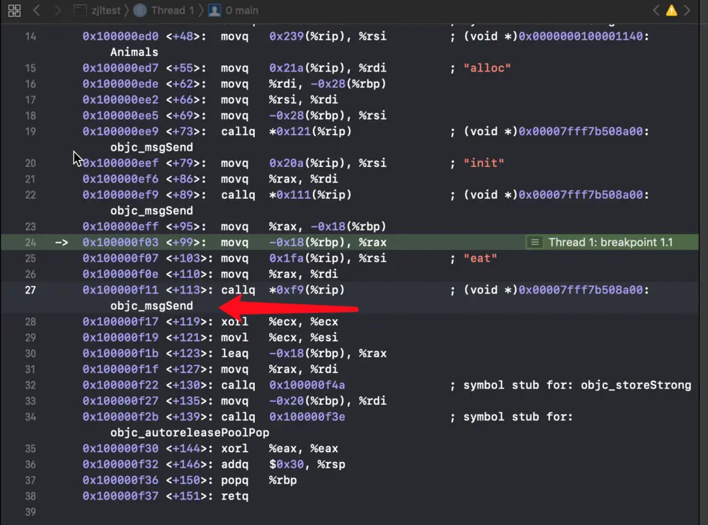 刚刚的方法通过Xcode调试调试汇编页面