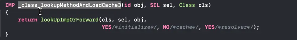 __class_lookupMethodAndLoadCache3 这个方法顾名思义是 查找方法列表并缓存,到了这里了我们发现源码里面并没有看到这个方法的定义。因为