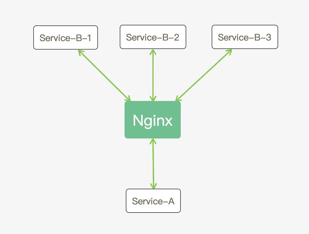 假设在分布式系统中有两个服务 Service-A (下文以“S-A”代称)和 Service-B(下文以“S-B”代称),当 S-A 想调用 S-B 时,我们首先想到的时直接在 S-A 中请求 S-B 所在服务器的 IP 地址和监听的端口,这在服务规模很小的情况下是没有任何问题的,但是在服务规模很大每个服务不止部署一个实例的情况下是存在一些问题的,比如 S-B 部署了三个实例 S-B-1、S-B-2 和 S-B-3,这时候 S-A 想调用 S-B 该请求哪一个服务实例的 IP 呢?还是将3个服务实例的 IP 都写在 S-A 的代码里,每次调用 S-B 时选择其中一个 IP?这样做显得很不灵活,这时我们想到了 Nginx 刚好就能很好的解决这个问题,引入 Nginx 后现在的架构变成了如下图这样: