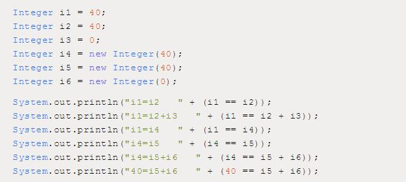 语句i4 == i5 + i6,因为+这个操作符不适用于Integer对象,首先i5和i6进行自动拆箱操作,进行数值相加,即i4 == 40。然后Integer对象无法与数值进行直接比较,所以i4自动拆箱转为int值40,最终这条语句转为40 == 40进行数值比较。