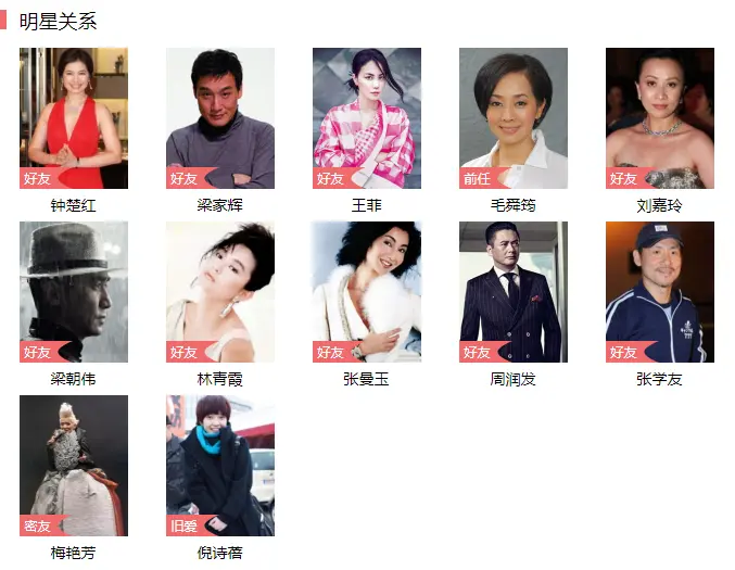 筛选出个人主页中含“明星关系”的数据,进一步爬取并解析出后续关系图谱所需的数据。以“张国荣-个人主页”为例,其直接相关的明星并不多,可见数据质量不一定多高,仅供练手,故不在此处过多纠缠。